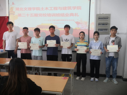 典礼伊始,全体起立,奏唱国歌《义勇军进行曲》,激昂的歌声在教室回荡。大会第二项,冷翔老师宣读土建学院第二十五期入党积极分子结业名单。大会第三项,刘潇老师为优秀学员及优秀组织者颁奖并号召同学们向这些优秀入党积极分子学习。大会第四项,本期党课优秀学员代表濮晨星作学习体会的发言,他希望自己在今后不断加强政治理论学习,提高思想道德修养,争取早日成为一名光荣的共产党员。大会第五项,弋兵书记作结业典礼讲话,他首先对大家顺利完成党课考试表示祝贺,希望同学们能将所学知识应用到今后的学习、生活和工作中,用理论指导实践,在实践中升华认识,不断开拓创新,积极进取。最后,弋兵书记宣布本期入党积极分子培训班正式结业。