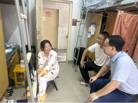外受伤。得知9月12日晚,我院本科24级一新生军训结束后被电动车剐蹭意情况后,班主任王丹妹第一时间赶到医院,陪同检查。第二天上午,道路交通工程系系主任周飞、道路交通工程系党支部书记周兴涛、辅导员王静静到寝室看望慰问。刚进新生寝室,就听到新生在与刚匹配的本科生导师李慧云通话,李慧云在电话中殷殷嘱托学生好好养伤。随后,周飞详细询问了学生受伤过程和治疗过程,嘱咐她多休息,按时抹药。周兴涛叮嘱学生以后一定要注意安全。最后,周飞代表学院给学生送上慰问品,祝她早日康复。