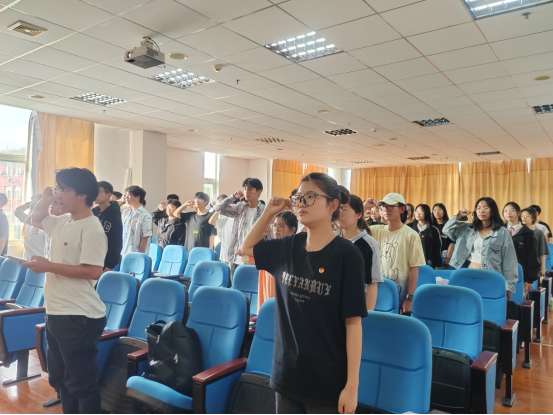 伴随庄严的国歌响起,会议拉开序幕。首先由冷翔发言介绍青马班并作纪律要求,接着由弋兵为青马班授旗。会上,师生一起重温入团誓词,随后由卢芙蓉作为学员代表讲话,接下来刘雨荷宣读文件,对参训学员做出了严格要求,希望同学们能够严于律己,规范自己的行为。最后,由弋兵致辞。他表达了对同学们的殷切期望,强调了作为优秀青年学子的责任与担当,希望全体参训学员要加强理论学习,明确自身定位和目标,加强实践锻炼,做坚定的马克思主义者,不断提高思想政治觉悟。