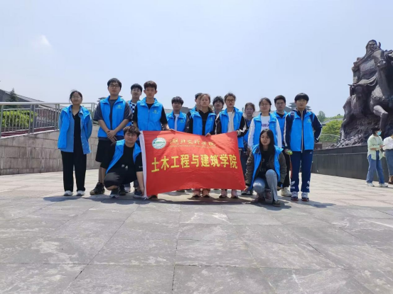 图为志愿者们在雕像前集合拍照