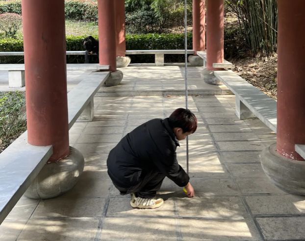 志愿者们通过实地勘测,采集了覆盖庭柱间距、高度、直径等多项数据,并辅以现场影像记录,如柱体结构、庭院全景等,形成了一套完整的测绘档案。例如:张鑫团队:明英亭庭高2.47米,柱间距2.57米,直径4.07米;闫静雯团队:海南亭庭高2.8米,庭宽2.87米,为庭院改造提供了直观依据。这些数据不仅体现了测绘工作的科学严谨性,更成为学校优化公共空间、提升设施安全性的重要参考。