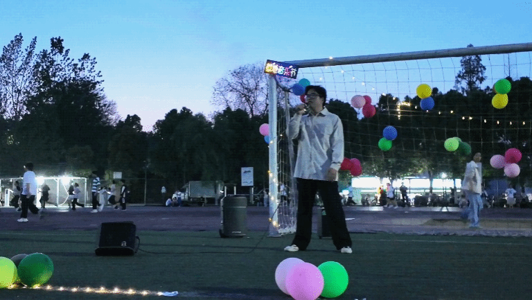 活动开始前,活动筹备组就精心布置场地。五彩的气球被一个个细心地绑在围栏上,象征希望的灯串也错落有致地缠绕其间。随着夜幕降临,灯串亮起,气球在微风中轻轻晃动,营造出梦幻而温馨的氛围,为这场音乐盛宴搭建起浪漫舞台。当夜幕轻轻落下,来自经济管理学院的同学用一段舞蹈点燃现场。强烈动感的节奏,整齐又炫酷的舞步,瞬间点燃现场气氛,台下同学们欢呼尖叫,掌声雷动,炽热的青春气息在春日夜晚肆意蔓延。民谣社成员以极具感染力的嗓音深情弹唱,舒缓旋律如潺潺溪流,真挚歌词诉说青春故事,紧紧抓住观众的心。同学们自发围坐在草坪上,轻声哼唱,沉浸在温暖的音乐氛围里。演出过程中,节目形式丰富多样。来自不同学院的同学们踊跃展示才艺,独唱、合唱等节目精彩纷呈。同学们用歌声传递情感,用热爱诠释青春,悠扬或激昂的歌声在校园上空久久回荡。期间,活动筹备组还贴心的为大家分发小零食与荧光棒。点点荧光在夜空中闪烁,同学们一边品尝着零食,一边欣赏演出,惬意十足。更有歌手热情与台下观众互动,将麦克风递向观众,全场大合唱,气氛被推向最高潮。